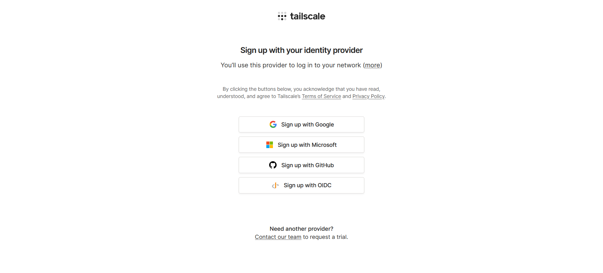 - You’ll be asked to sign up using an “identity provider”. Basically, rather than making you create another username and password, Tailscale just has you sign in using another account, like when sites offer to let you “sign in with Google”. I used a Google account to sign up, and that’ll probably be the easiest method to use.